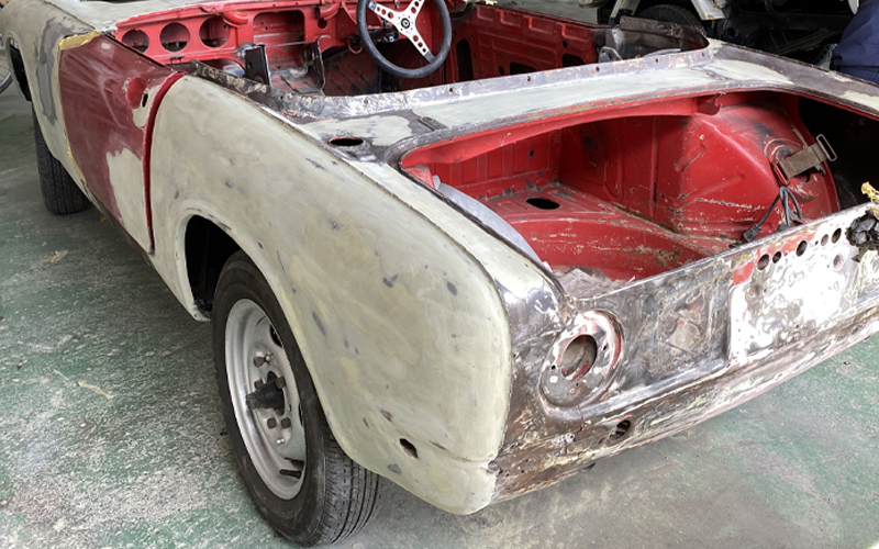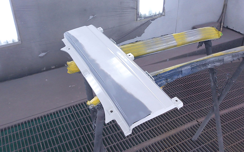 へこみ、キズ、サビの箇所をしっかり確認していきます。塗装色の密着をよくするためにサフェーサー(下地塗料)を吹き付けます。乾燥させている間に塗料の配合データを基に色合わせします。